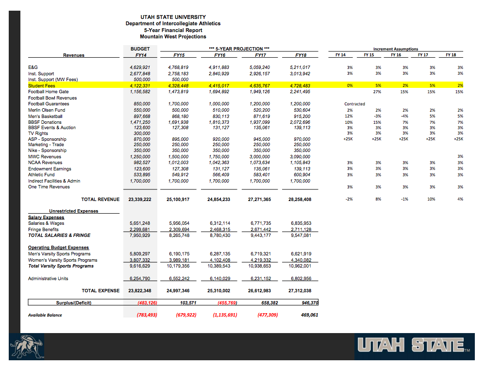 I’ll only mention one more thing; the USU Athletics Department cannot sustain itself without further fee increases. So, in spite of the fact that we already pay way more than anyone else, we will probably end up paying even more. Here is the Athletics Department’s plan for the future: